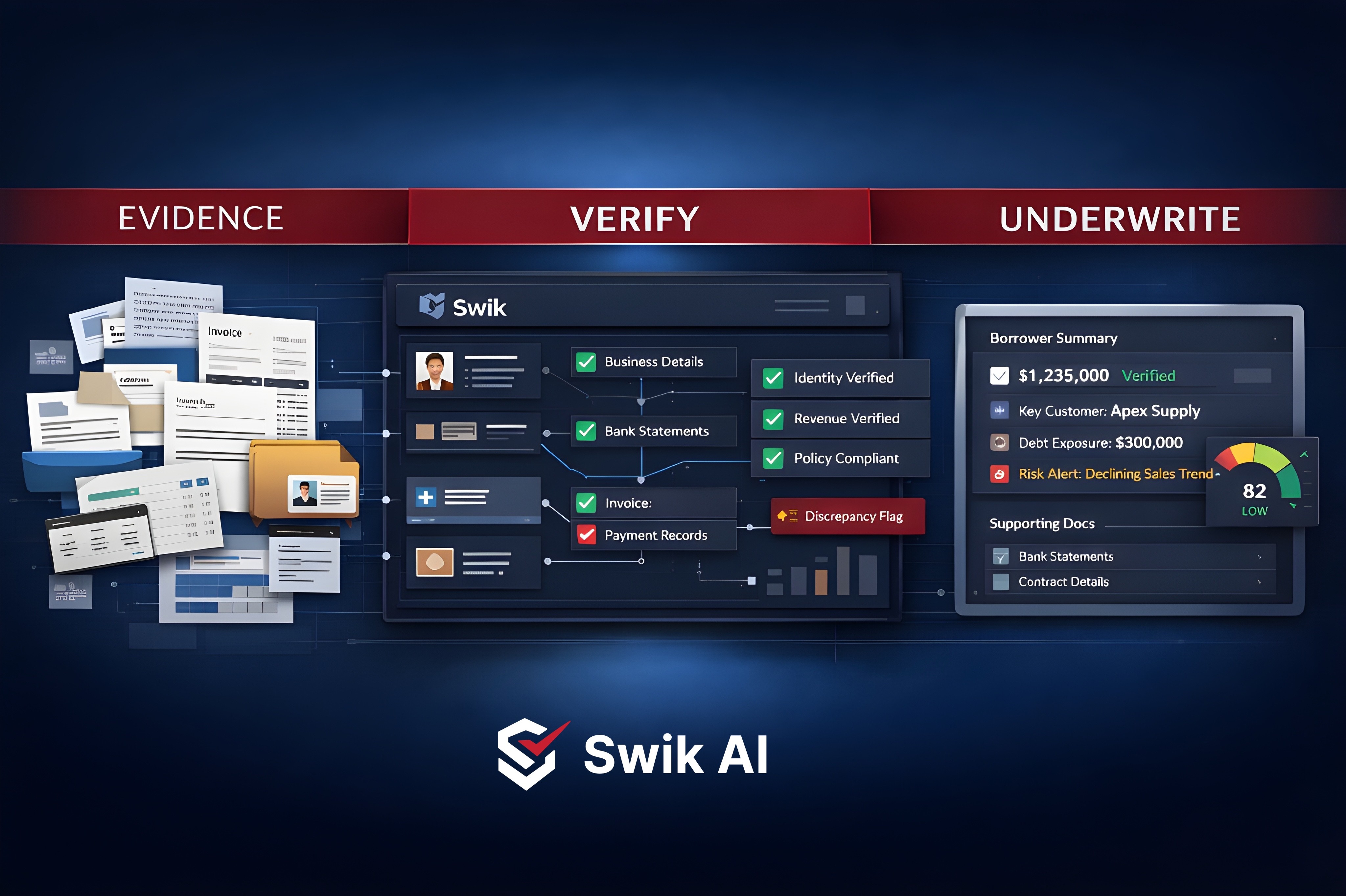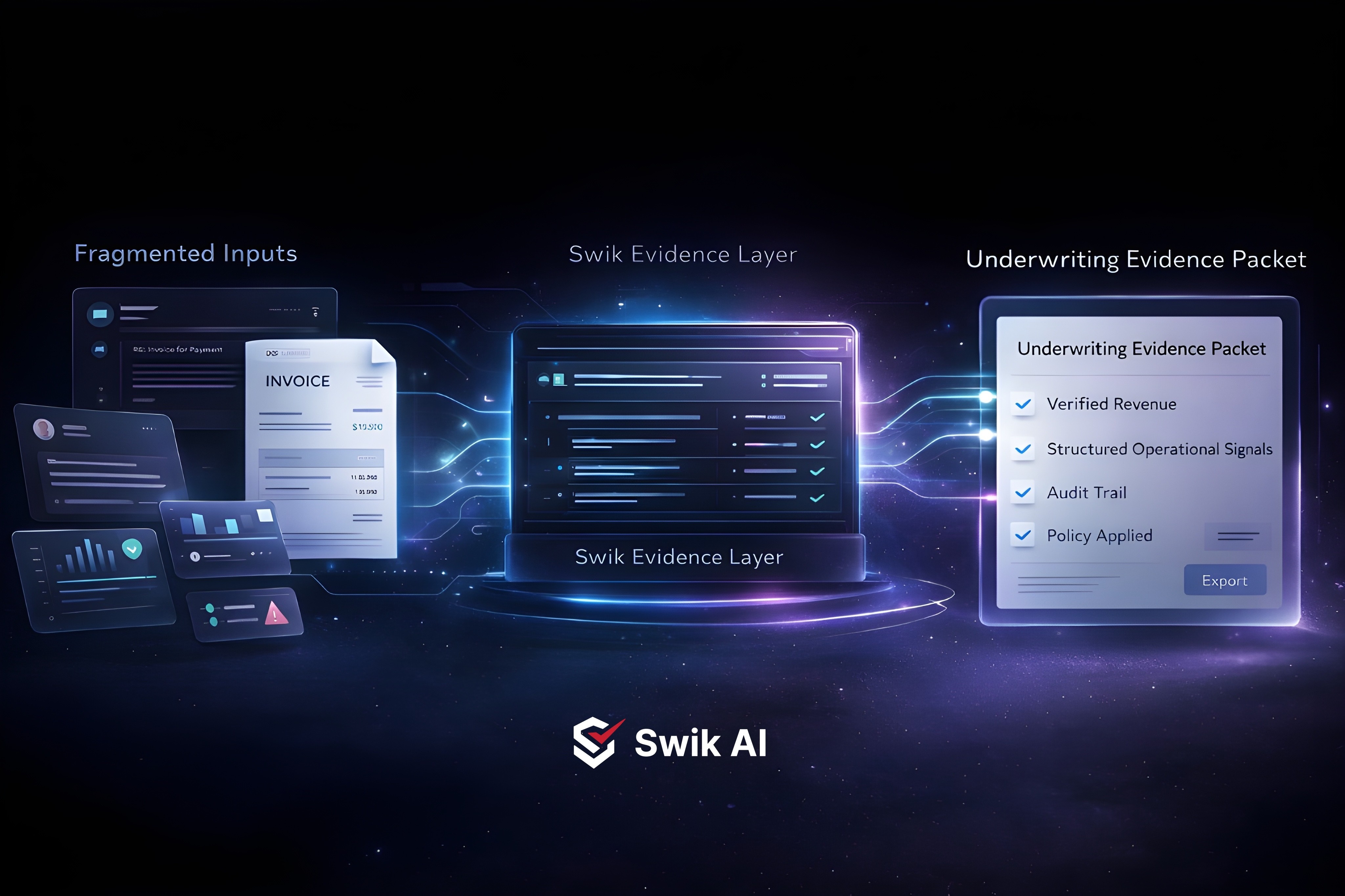 Swik verifies revenue and structures operational signals to enable faster, more defensible underwriting.